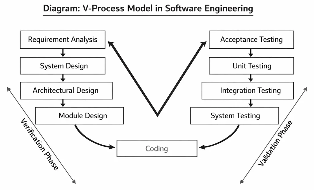 The V-Process Model is a software development model that follows a sequential approach like the Waterfall model but focuses strongly on testing at each stage. In this model, development and testing activities run in parallel. Moreover, every development phase has a corresponding testing phase. Therefore, it helps in early detection of errors and improves software quality. As a result, it is widely used in projects where high accuracy and validation are required.